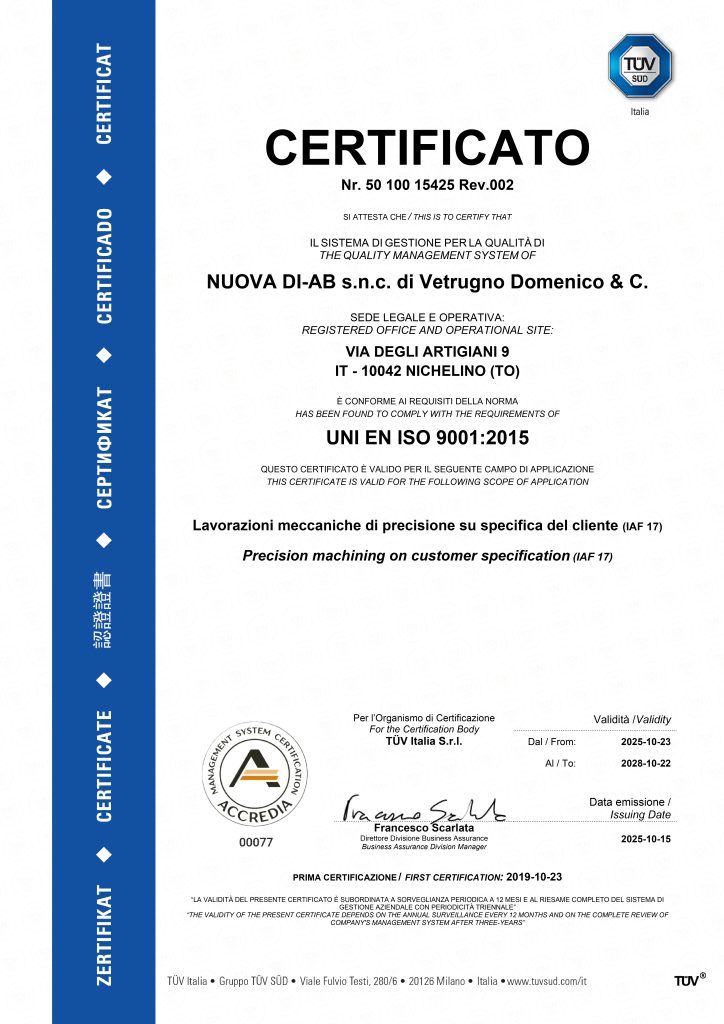 La Torneria NUOVA DI-AB è certificata ISO 9001:2015